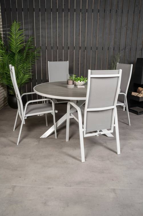 Pascal matbord med en gråfärgad rund topp i aintwood och vita bordsben i aluminium. Bordets mått: Diameter: 140 cm, Höjd: 74 cm. Matchas med 4st stapelbara Cassie matstolar i grå textilene och vita stolsben i aluminium. Stolens mått: Totalhöjd: 95 cm, Bredd: 44 cm, Djup: 42 cm, Sitthöjd: 47 cm. Bord och stol kräver enklare montering.