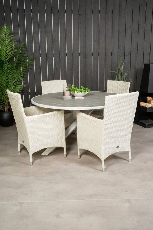 Pascal matbord med en gråfärgad rund topp i aintwood och vita bordsben i aluminium. Bordets mått: Diameter: 140cm, Höjd: 74cm. Matchas med 4st Meja matstolar. Stolens mått: Totalhöjd: 92cm, Bredd: 48cm, Djup: 43cm, Sitthöjd: 48cm. Bord och stol kräver enklare montering.