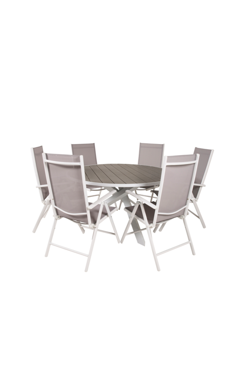 Pascal matbord med en gråfärgad rund topp i aintwood och vita bordsben i aluminium. Bordets mått: Diameter: 140 cm, Höjd: 74 cm. Matchas med 6st fällbara Bliss matstolar i grå textilene och vita stolsben i aluminium. Stolens mått: Totalhöjd: 107,5 cm, Bredd: 45 cm, Djup: 44 cm, Sitthöjd: 43 cm. Bord och stol kräver enklare montering.