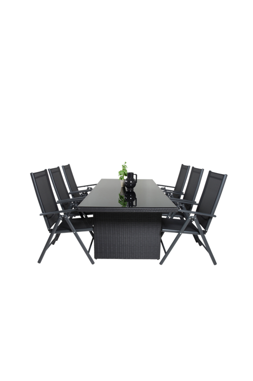 Prim matbord med topp i svart glas och bordsben i aluminium. Bordets mått: Längd: 200 cm, Bredd: 100 cm, Höjd: 74 cm. Matchas med 6 st fällbara Bliss matstolar i svart textilene och svarta stolsben i aluminium. Stolens mått: Totalhöjd: 107,5 cm, Bredd: 45 cm, Djup: 44 cm, Sitthöjd: 43 cm. Bord och stol kräver enklare montering.