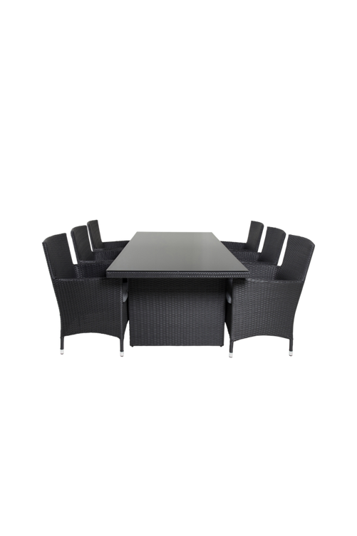 Prim matbord med topp i svart glas och bordsben i aluminium. Bordets mått: Längd: 200cm, Bredd: 100cm, Höjd: 74cm. Matchas med 6st svarta Meja matstolar med gråa stolsdynor och stolsben i aluminium och konstrotting. Stolens mått: Totalhöjd: 92cm, Bredd: 48cm, Djup: 43cm, Sitthöjd: 48cm. Bord och stol kräver enklare montering.