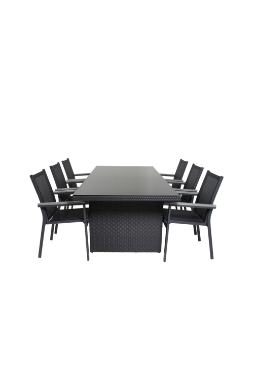 Prim matbord med topp i svart glas och bordsben i aluminium. Bordets mått: Längd: 200cm, Bredd: 100cm, Höjd: 74cm. Matchas med 6st stapelbara Pascal matstolar i svart textilene och grå aintwood med svarta ben i aluminium. Stolens mått: Totalhöjd: 60cm, Bredd: 47cm, Djup: 42cm, Sitthöjd: 43,5cm. Bord och stol kräver enklare montering.
