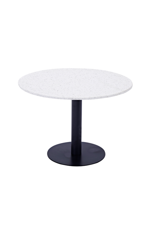 Ett retroinspirerat exklusivt bord med en bordsskiva gjord av terazzo och ett snyggt metall ben i svart. Runt bordet får 4 personer plats. Diameter 106 cm. Höjd 75 cm. Kräver enklare montering.