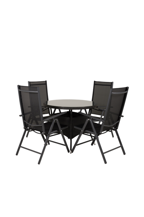 Vass matbord med en svart rund topp i glas och bordsben i aluminium. Bordets mått: Diameter: 90 cm, Höjd: 74 cm. Matchas med 4 st fällbara Bliss matstolar i svart textilene och svarta stolsben i aluminium. Stolens mått: Totalhöjd: 107,5 cm, Bredd: 45 cm, Djup: 44 cm, Sitthöjd: 43 cm. Bord och stol kräver enklare montering.