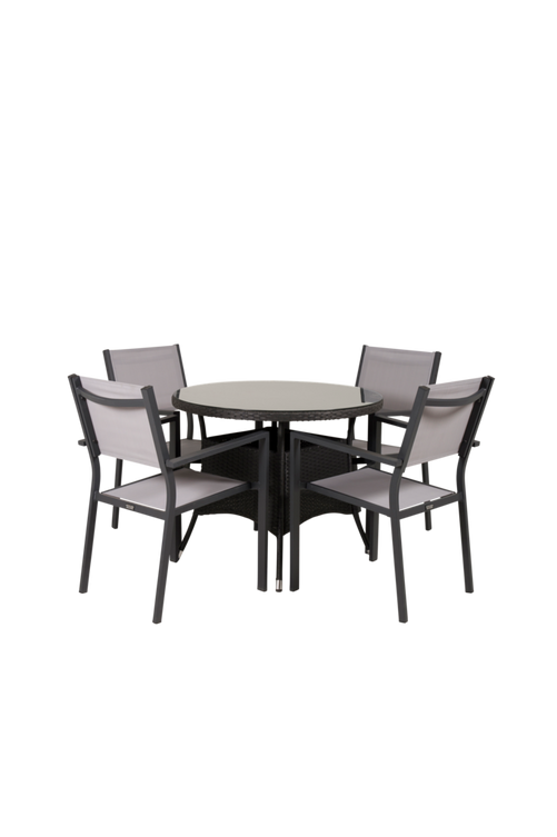 Vass matbord med en svart rund topp i glas och bordsben i aluminium. Bordets mått: Diameter: 90cm, Höjd: 74cm. Matchas med 4st stapelbara Cassie matstolar textilene och stolsben i aluminium. Stolens mått: Totalhöjd: 88cm, Bredd: 50cm, Djup: 44cm, Sitthöjd: 43cm. Bord och stol kräver enklare montering.