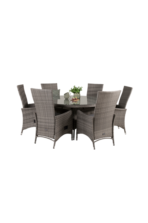 Vass matbord med en rund grå topp i glas och bordsben i aluminium. Bordets mått: Diameter: 150cm, Höjd: 74cm. Matchas med 6st fällbara Prim matstolar i grå färg med gråa stolsdynor och stolsben i konstrotting och aluminium. Stolens mått: Totalhöjd: 110cm, Bredd: 47cm, Djup: 51cm, Sitthöjd: 42,5cm. Bord och stol kräver enklare montering.