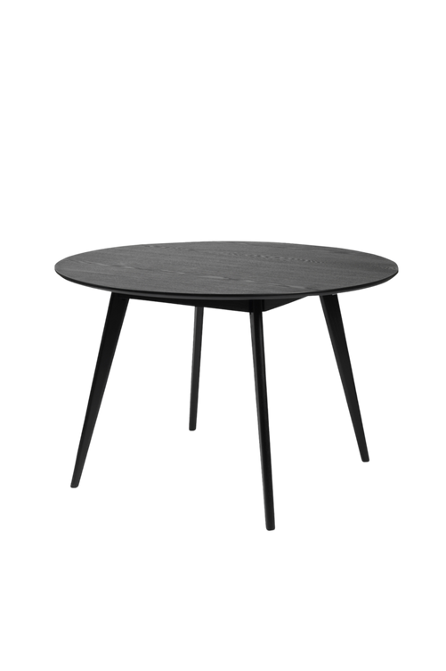 Retroinspirerat matbord i nordisk design med lätt utställda ben. Bordsskiva i MDF med svartlackad askfaner och ben i svartlackat gummiträ. Ø 115, höjd 75 cm. Montera själv.