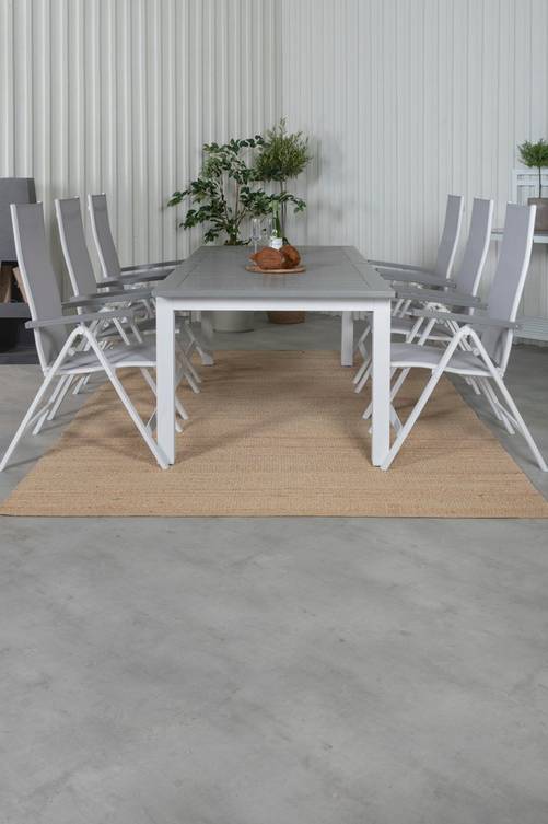Alf matbord med en toppskiva i aintwood och bordsben i aluminium. Bordets mått: Höjd: 76 cm, Bredd: 100 cm, Längd: 224 cm. Matchas med 6 st Alf positionsstolar, fällbara i 5 olika lägen. Stolen är tillverkad i textilene med stolsben i aluminium. Stolens mått: Totalhöjd: 109.5 cm, Bredd: 59 cm, Djup: 67 cm. Sitthöjd: 44 cm. Sittbredd: 46 cm. Sittdjup: 44 cm. Bord och stol kräver enklare montering.