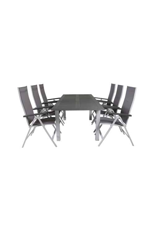 Alf matbord med en toppskiva i aintwood och bordsben i aluminium. Bordets mått: Höjd: 75 cm, Bredd: 90 cm, Längd: 152 cm. Matchas med 6 st Alf positionsstolar, fällbara i 5 olika lägen. Stolen är tillverkad i textilene med stolsben i aluminium. Stolens mått: Totalhöjd: 109.5 cm, Bredd: 59 cm, Djup: 67 cm. Sitthöjd: 44 cm. Sittbredd: 46 cm. Sittdjup: 44 cm. Bord och stol kräver enklare montering.