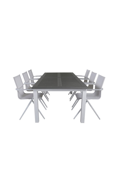 Alf matbord med en toppskiva i aintwood och bordsben i aluminium. Bordets mått: Höjd: 76 cm, Bredd: 100 cm, Längd: 224 cm. Matchas med 6 st Malou matstolar i aluminium. Stolens mått: Totalhöjd: 86 cm, Bredd: 58 cm, Djup: 63 cm. Sitthöjd: 42 cm. Sittbredd: 42 cm. Sittdjup: 42 cm. Bord och stol kräver enklare montering.