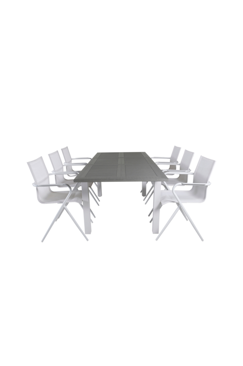 Alf matbord med en bordstopp i aintwood och bordsben i aluminium. Matchas med 6 st Malou matstolar med stolsits i aluminium och stolsben i aluminium. Bord och stol kräver enklare montering. Bordets mått: Längd: 160 cm, Bredd: 90 cm, Höjd: 75 cm. Stolens mått: Sittdjup: 42 cm, Sittbredd: 42 cm, Sitthöjd: 42 cm.
