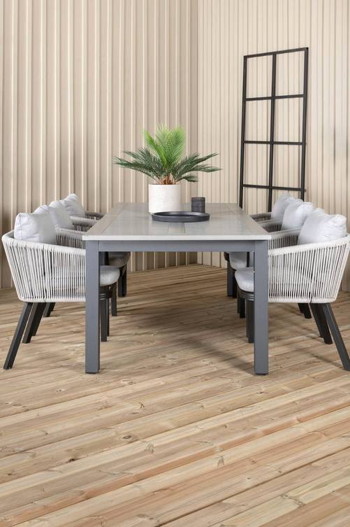 Alf matbord med en toppskiva i aintwood och bordsben i aluminium. Bordets mått: Höjd: 74 cm, Bredd: 100 cm, Längd: 224 cm. Matchas med 6 st Uppsala matstolar. Stolen är tillverkad i rep och polyester med stolsben i aluminium. Stolens mått: Totalhöjd: 73 cm, Bredd: 60 cm, Djup: 62.5 cm. Sitthöjd: 41 cm. Sittbredd: 43 cm. Sittdjup: 50 cm. Bord och stol kräver enklare montering.