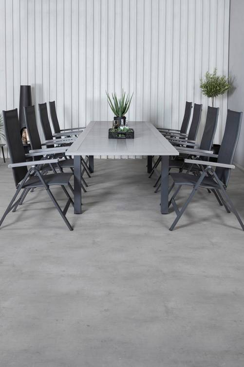 Alf matbord med en toppskiva i aintwood och bordsben i aluminium. Bordets mått: Höjd: 74 cm, Bredd: 100 cm, Längd: 224 cm. Matchas med 8 st Alf positionsstolar, fällbara i 5 olika lägen. Stolen är tillverkad i textilene med stolsben i aluminium. Stolens mått: Totalhöjd: 109.5 cm, Bredd: 59 cm, Djup: 67 cm. Sitthöjd: 44 cm. Sittbredd: 46 cm. Sittdjup: 44 cm. Bord och stol kräver enklare montering.