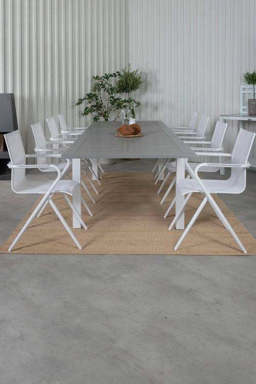 Alf matbord med en toppskiva i aintwood och bordsben i aluminium. Bordets mått: Höjd: 76 cm, Bredd: 100 cm, Längd: 224 cm. Matchas med 8 st Malou matstolar i aluminium. Stolens mått: Totalhöjd: 86 cm, Bredd: 58 cm, Djup: 63 cm. Sitthöjd: 42 cm. Sittbredd: 42 cm. Sittdjup: 42 cm. Bord och stol kräver enklare montering.