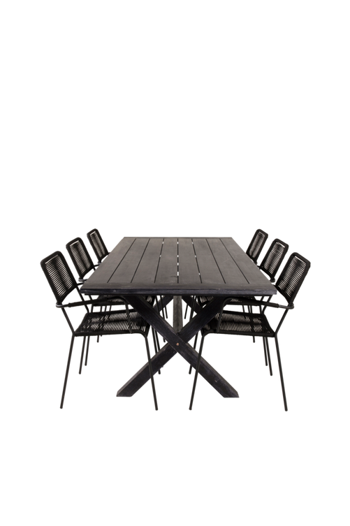 Ariel matbord med en topp i acacia och bordsben i acacia. Bordets mått: Längd: 200cm, Bredd: 100cm, Höjd: 75cm. Matchas med 6st Levis matstolar i rep och stolsben i aluminium. Stolens mått: Totalhöjd: 85cm, Bredd: 55cm, Djup: 66cm, Sitthöjd: 47cm. Bord och stol kräver enklare montering.