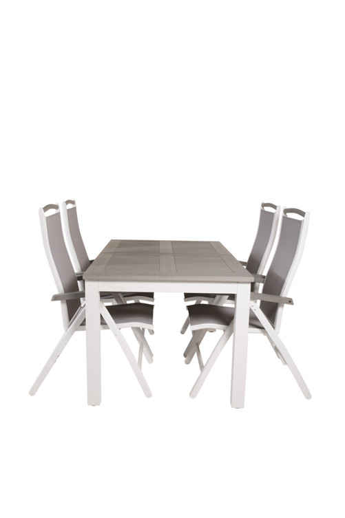 Athena matbord med en topp i grå aintwood och vita bordsben i aluminium. Bordets mått: Längd förlängningsbar mellan: 160cm och 240cm, Bredd: 90cm, Höjd: 75cm. Matchas med 4st 5:pos Albany matstolar i grå textilene med detaljer i aintwood och vita stolsben i aluminium. Stolens mått: Totalhöjd: 109cm, Bredd: 46cm, Djup: 49cm, Sitthöjd: 44cm. Bord och stol kräver enklare montering.