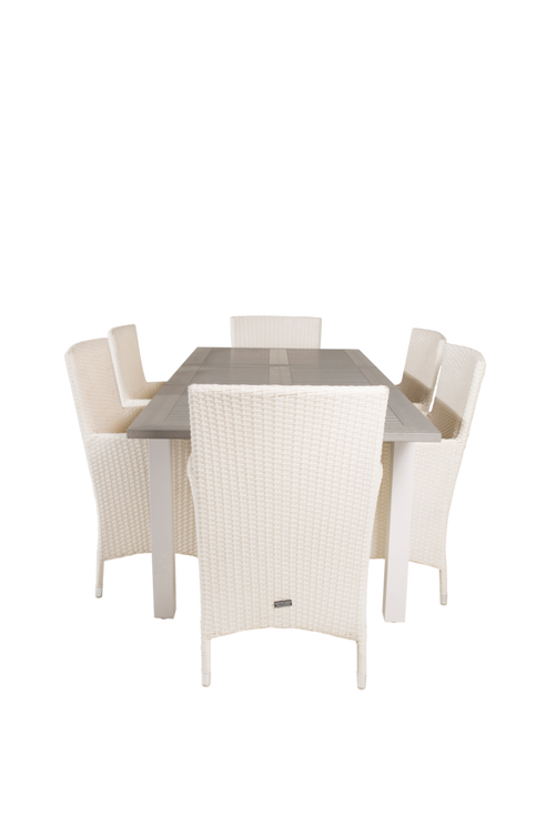 Athena matbord med en topp i grå aintwood och vita bordsben i aluminium. Bordets mått: Längd förlängningsbar mellan: 160cm och 240cm, Bredd: 90cm, Höjd: 75cm. Matchas med 6st Meja matstolar i grå konstrotting med en grå dyna och gråa stolsben i aluminium. Stolens mått: Totalhöjd: 92cm, Bredd: 48cm, Djup: 43cm, Sitthöjd: 48cm. Bord och stol kräver enklare montering.