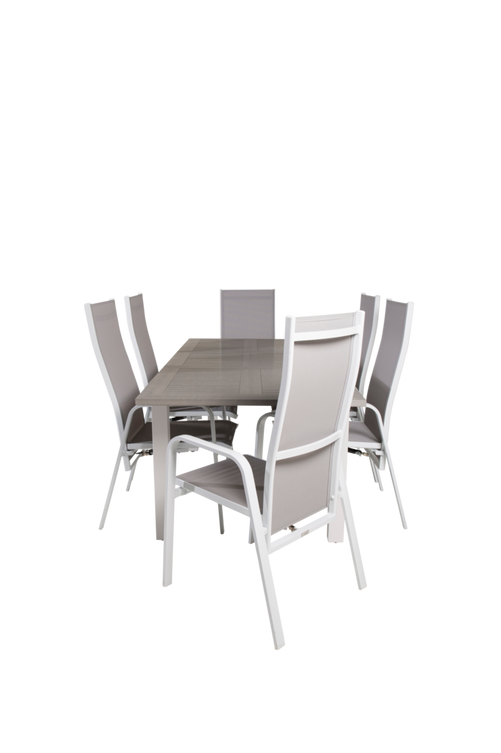 Athena matbord med en topp i grå aintwood och vita bordsben i aluminium. Bordets mått: Längd förlängningsbar mellan: 160cm och 240cm, Bredd: 90cm, Höjd: 75cm. Matchas med 6st stapelbara och justerbara Cassie matstolar i grå textilene och vita stolsben i aluminium. Stolens mått: Totalhöjd: 110cm, Bredd: 43cm, Djup: 50cm, Sitthöjd: 44cm. Bord och stol kräver enklare montering.