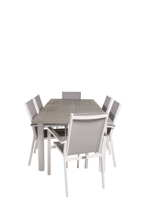 Athena matbord med en topp i grå aintwood och vita bordsben i aluminium. Bordets mått: Längd förlängningsbar mellan: 152cm och 210cm, Bredd: 90cm, Höjd: 75cm. Matchas med 6st stapelbara Pascal matstolar i grå textilene med detaljer i grå aintwood och vita stolsben i aluminium. Stolens mått: Totalhöjd: 60cm, Bredd: 57cm, Djup: 89cm, Sitthöjd: 43,5cm. Bord och stol kräver enklare montering.