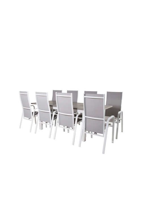 Athena matbord med en gråfärgad topp i aintwood trä och vita bordsben i aluminium. Bordets mått: Längd förlängningsbar mellan: 160cm och 240cm, Bredd: 90cm, Höjd: 75cm. Matchas med 8st stapelbara Cassie matstolar i grå textilene och vita stolsben i aluminium. Stolens mått: Totalhöjd: 95cm, Bredd: 34cm, Djup: 42cm, Sitthöjd: 47cm. Bord och stol kräver enklare montering.