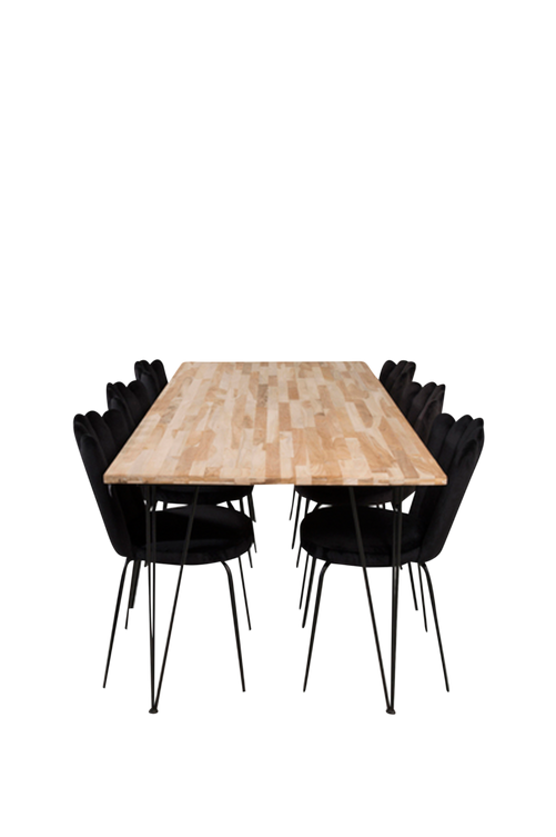 Bankok Rektangulärt Matbord i modern design med stomme och ben i pulverlackerad metall. Med en bordsskiva i ljusTeak. Mått: Längd: 200 cm. Bredd: 90 cm. Höjd: 75 cm. + 6 stycken Furniture Fashion. Limhamn Light Matstolar med stomme och ben i metall. Hög rygg i en exklusivt utformad design samt rygg och sits i sammet. Mått: Sitthöjd: 48 cm. Sittbredd: 43 cm. Sittdjup: 41.5 cm. Lättare montering krävs.