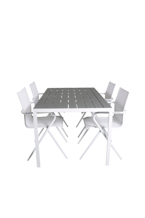 Barcelona Matbord med en bordskiva i polywood och bordsben i metall. Matchas med 4 st Malou Matstolar med en stolsits i textilene och stolsben i metall. Bord och stol kräver enklare montering. Bordets mått: Längd: 150cm. Bredd: 90cm. Stolens mått: Sittbredd: 42cm. Sitthöjd: 42cm. Sittdjup: 42cm.