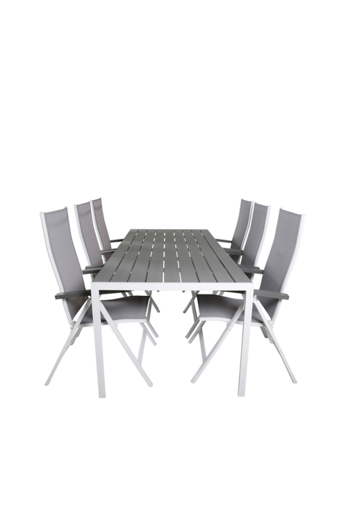 Barcelona matbord med en bordstopp i polywood och bordsben i aluminium. Matchas med 6 st Alf positionsstolar som är fällbara i 5 olika lägen med stolsits i textilene och stolsben i aluminium. Bord och stol kräver enklare montering. Bordets mått: Längd: 205 cm, Bredd: 90 cm, Höjd: 74 cm. Stolens mått: Sittdjup: 44 cm, Sittbredd: 46 cm, Sitthöjd: 44 cm.