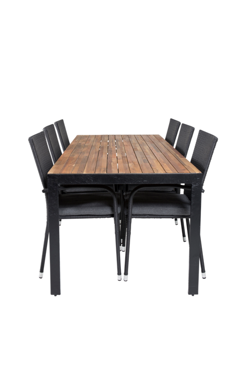 Belinda matbord med en naturfärgad topp i acacia och bordsben i aluminium. Bordets mått: Längd: 205cm, Bredd: 90cm, Höjd: 76cm. Matchas med 6st stapelbara Astrid matstolar med stolsben i stål. Stolens mått: Totalhöjd: 96cm, Bredd: 45cm, Djup: 47cm, Sitthöjd: 44cm. Bord och stol kräver enklare montering.