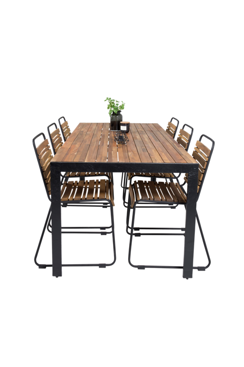 Belinda matbord med en naturfärgad topp i acacia och bordsben i aluminium. Bordets mått: Längd: 205cm, Bredd: 90cm, Höjd: 76cm. Matchas med 6st Belinda matstolar i acacia och stolsben i stål. Stolens mått: Totalhöjd: 86cm, Bredd: 44cm, Djup: 41cm, Sitthöjd: 47cm. Bord och stol kräver enklare montering.