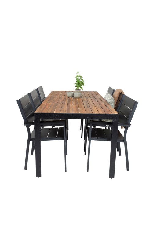 Belinda matbord med en naturfärgad topp i acacia och bordsben i aluminium. Bordets mått: Längd: 205cm, Bredd: 90cm, Höjd: 76cm. Matchas med 6st stapelbara Louis matstolar i aintwood och stolsben i aluminium. Stolens mått: Totalhöjd: 89cm, Bredd: 42,7cm, Djup: 45,5cm, Sitthöjd: 41cm. Bord och stol kräver enklare montering.