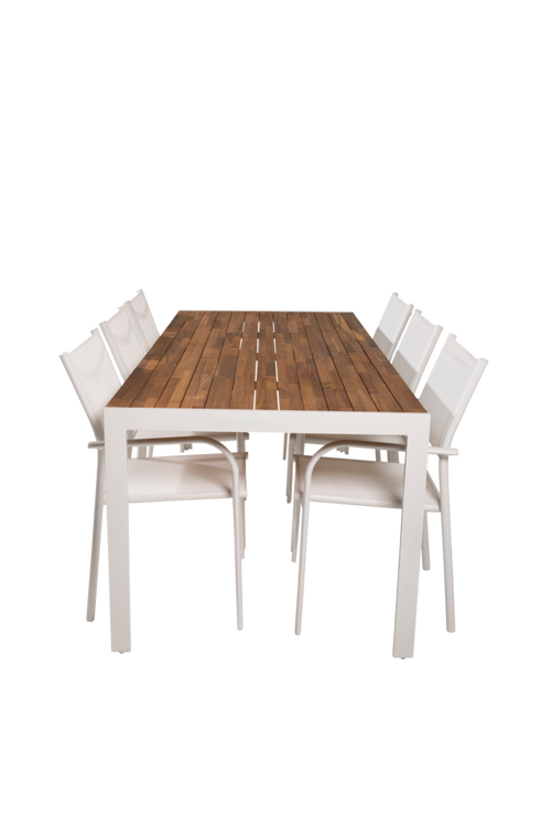 Belinda matbord med en naturfärgad topp i acacia och vita bordsben i aluminium. Bordets mått: Längd: 205cm, Bredd: 90cm, Höjd: 76cm. Matchas med 6st stapelbara Samos matstolar i vit textilene och vita stolsben i aluminium. Stolens mått: Totalhöjd: 55cm, Bredd: 46cm, Djup: 45cm, Sitthöjd: 45cm. Bord och stol kräver enklare montering.