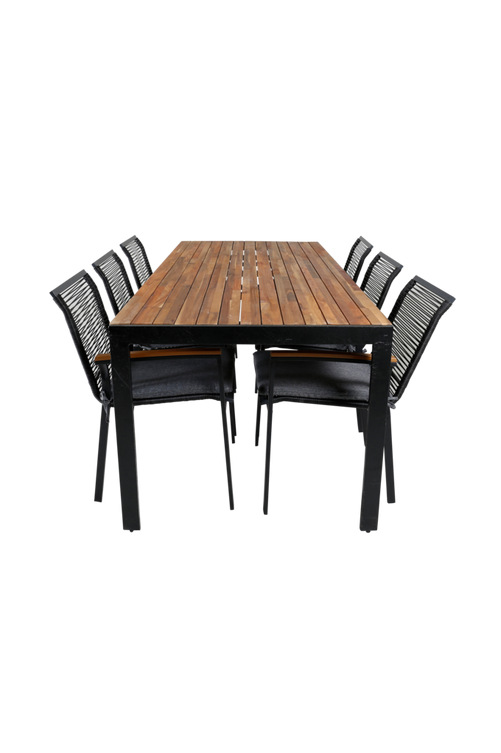 Belinda Matbord med en bordskiva i akacia och bordsben i metall. Matchas med 6 st Norby Matstolar med en stolsits i 100% polyester och stolsben i metall. Bord och stol kräver enklare montering. Bordets mått: Längd: 205cm. Bredd: 90cm. Stolens mått: Sittbredd: 42cm. Sitthöjd: 45.5cm. Sittdjup: 43.5cm.