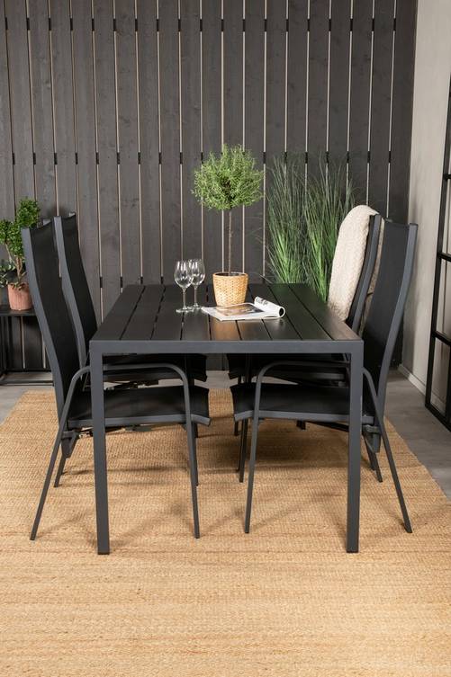Bliss matbord med en topp i svart aintwood och svarta bordsben i aluminium. Bordets mått: Längd: 150cm, Bredd: 90cm, Höjd: 74cm. Matchas med 4st stapelbara och justerbara Cassie matstolar i svart textilene och svarta stolsben i aluminium. Stolens mått: Totalhöjd: 110cm, Bredd: 56,5cm, Djup: 65cm, Sitthöjd: 44cm. Bord och stol kräver enklare montering.