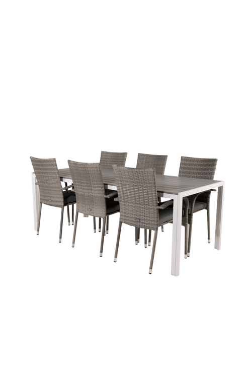 Bliss matbord med en topp i aintwood och bordsben i aluminium. Bordets mått: Längd: 205cm, Bredd: 90cm, Höjd: 74cm. Matchas med 6st stapelbara Astrid matstolar i konstrottning och stolsben i stål. Stolens mått: Totalhöjd: 96cm, Bredd: 45cm, Djup: 47cm, Sitthöjd: 44cm. Bord och stol kräver enklare montering.