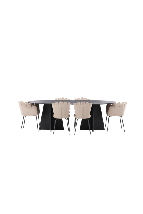 En stilren och pampig matgrupp! Matbordet Bootcut har en unik design med en oval bordsskiva i svart MDF med faner och en säregen stomme med två konformade ben i öppen design. Den tunna bordsskivan skapar ett minimalistiskt intryck och är en smakfull kontrast till den mer robusta stommen. Här tillsammans med våra bekväma matstolar från serien Limhamn. Stolen är en modern favorit i många hushåll med sin inbjudande design, dekorativa snäckformade rygg med dekorsömmar och en rund sits i smakfullt beige sammetstyg. Benen är i svart pulverlackerad metall. Luta dig tillbaka och njut!