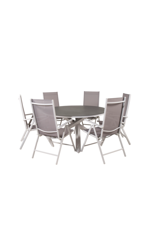 Cassie matbord med en rund topp i sprayglas och bordsben i aluminium. Bordets mått: Diameter: 140cm, Höjd: 72cm. Matchas med 6st Bliss 5:pos matstolar i textilene och stolsben i aluminium. Stolens mått: Totalhöjd: 107,5cm, Bredd: 55cm, Djup: 62cm, Sitthöjd: 43cm. Bord och stol kräver enklare montering.