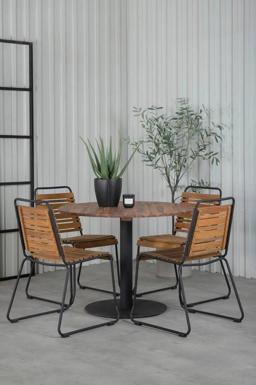 Charlie matbord med en bordskiva i akacia och bordsben i metall. Matchas med 4 st Belinda Matstolar med en stolsits i trä och stolsben i metall. Bord och stol kräver enklare montering. Bordets mått: Diameter: 100 cm. Höjd: 74 cm. Stolens mått: Sittbredd: 44 cm. Sitthöjd: 47 cm. Sittdjup: 41 cm.