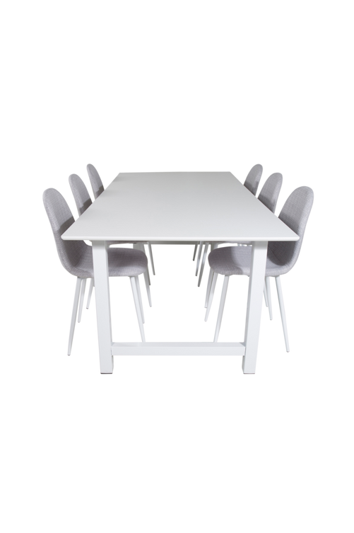 Cissi matbord med en topp i MDF och bordsben i metall. Matchas med 6st Penally matstolar med stolsits i polyester och stolsben i metall. Bord och stol kräver enklare montering. Bordets mått: Längd: 220cm, Bredd: 100cm, Höjd: 75cm. Stolens mått: Sittdjup: 39,5cm, Sittbredd: 41cm, Sitthöjd: 45,5cm.