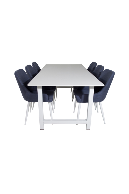 Cissi matbord med en topp i MDF och bordsben i metall. Matchas med 6st Pia matstolar med stolsits i polyester och stolsben i metall. Bord och stol kräver enklare montering. Bordets mått: Längd: 220cm, Bredd: 100cm, Höjd: 75cm. Stolens mått: Sittdjup: 45cm, Sittbredd: 46cm, Sitthöjd: 47cm.
