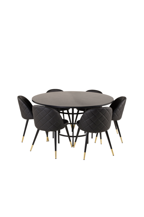 Copenhagen Furniture Fashion matbord med en rund topp i MDF samt fanér och bordsben i metall. Bordets mått: Diameter: 140cm, Höjd: 74cm. Matchas med 6st Venture Design Valleta matstolar i konstläder och stolsben i metall. Stolens mått: Totalhöjd: 77cm, Bredd: 47cm, Djup: 48cm, Sitthöjd: 47cm. Bord och stol kräver enklare montering.