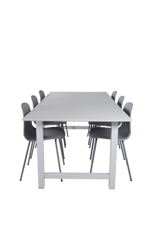 Count matbord med en bordstopp i MDF och bordsben i metall. Matchas med 6 st Arctic matstolar med stolsits i plast och stolsben i metall. Bord och stol kräver enklare montering. Bordets mått: Längd: 220 cm, bredd: 100 cm, höjd: 75 cm. Stolens mått: Sittbredd: 49 cm, sittdjup: 41 cm, sitthöjd: 45 cm.
