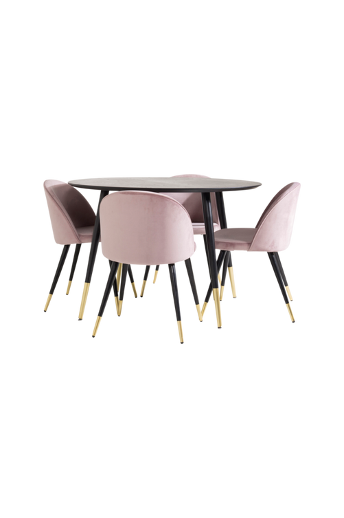 Doris matbord med en rund topp i MDF och bordsben i metall med mässingdetaljer. Matchas med 4st Valleta matstolar med stolsits i sammet och stolsben i metall med mässingdetaljer. Bordets mått: Diameter: 115cm, Höjd: 75cm. Stolens mått: Sittdjup: 42,5cm, Sittbredd: 41cm, Sitthöjd: 46,5cm.