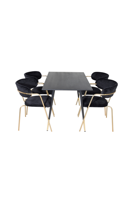 Doris matbord med en topp i MDF och bordsben i metall med detaljer i mässing. Matchas med 4st Atticus matstolar med stolsits i sammet och stolsben i metall med detaljer i mässing. Bord och stol kräver enklare montering.