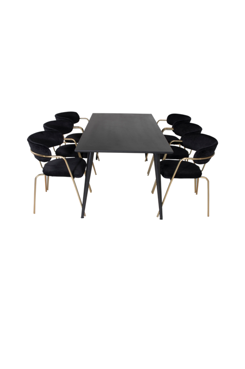 Doris matbord men topp i MDF och bordsben i metall. Matchas med 6st Atticus matstolar med stolsits i sammet och stolsben i metall med detaljer i mässing. Bord och stol kräver enklare montering.