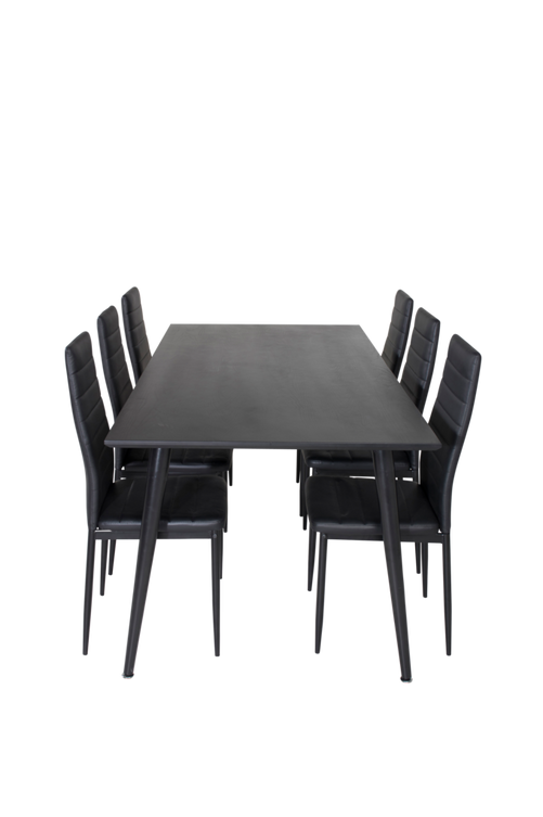 Doris matbord men topp i MDF och bordsben i metall. Matchas med 6st Sandviken matstolar med stolsits i konstläder och stolsben i metall. Bord och stol kräver enklare montering.