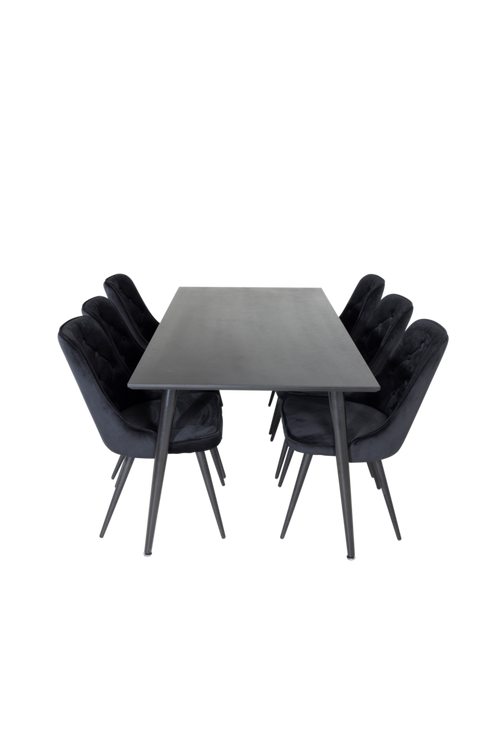 Doris matbord men topp i MDF och bordsben i metall. Matchas med 6st Valleta matstolar med stolsits i sammet med dekorsöm och stolsben i metall. Bord och stol kräver enklare montering.