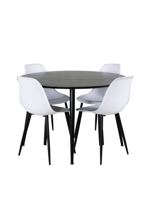 Matbord Doris med bordsskiva i MDF bordsben i metall. Matchas med 4 stycken Penally matstolar med stolsits i plast och stolsben i järn. Bord och stol kräver enklare montering. Bordets mått: Diameter: 115cm, Höjd: 75cm. Stolens mått: Sittdjup: 39cm, Sittbredd: 45cm, Sitthöjd: 46cm.