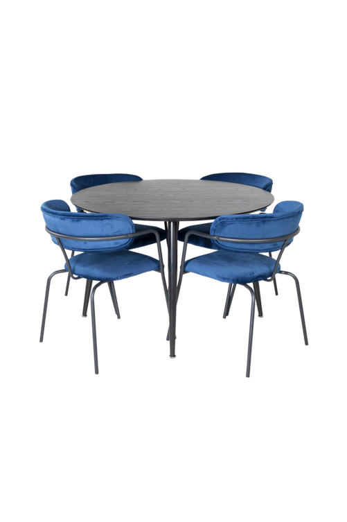 Doris matbord med en topp i MDF och bordsben i metall. Matchas med 4st Atticus matstolar med stolsts i sammet och stolsben i metall. Bord och stol kräver enklare montering. Bordets mått: Diameter: 115cm, Höjd: 75cm. Stolens mått: Sittdjup: 43,5cm, Sittbredd: 47cm, Sitthöjd: 47cm.