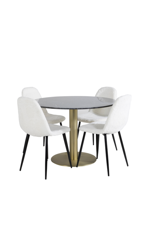 Estri matbord med en rund topp i marmor och bordsben i metall . Matchas med 4st Penally matstolar med stolsits i teddy polyester och stolsben i metall. Bord och stol kräver enklare montering. Bordets mått: Diameter: 106cm, Höjd: 75cm. Stolens mått: Sittdjup: 39,5cm, Sittbredd: 41cm, Sitthöjd: 45,5cm.