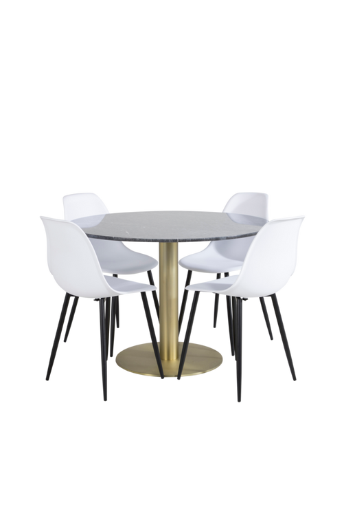Estri matbord med en rund topp i marmor och bordsben i metall . Matchas med 4st Penally matstolar med stolsits i konstläder med dekorsöm och stolsben i metall med snurrfunktion. Bord och stol kräver enklare montering. Bordets mått: Diameter: 106cm, Höjd: 75cm. Stolens mått: Sittdjup: 39cm, Sittbredd: 44cm, Sitthöjd: 48cm.